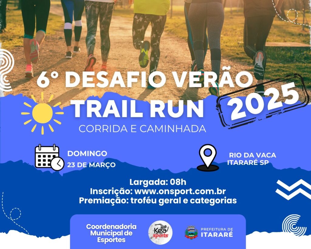 A Prefeitura de Itararé (SP), por meio da Coordenadoria de Esportes e em parceria com a Kea Sports promoverá no domingo (23) o 6º Desafio Verão – Trail Run. O evento, com largada prevista para as 8h da manhã, levará os atletas à um percurso de sete quilômetros em meio a trilhas e estradas de terra no Rio da Vaca, um dos principais atrativos turísticos do município.